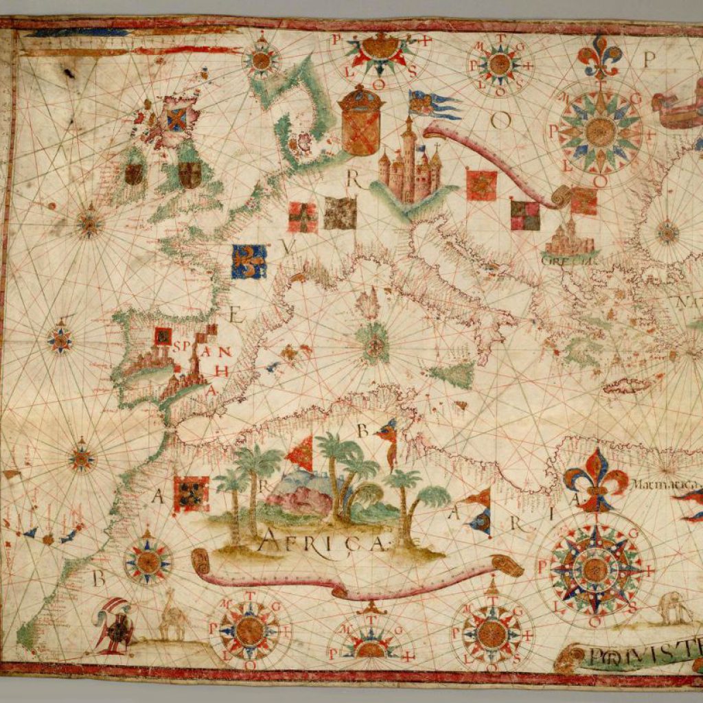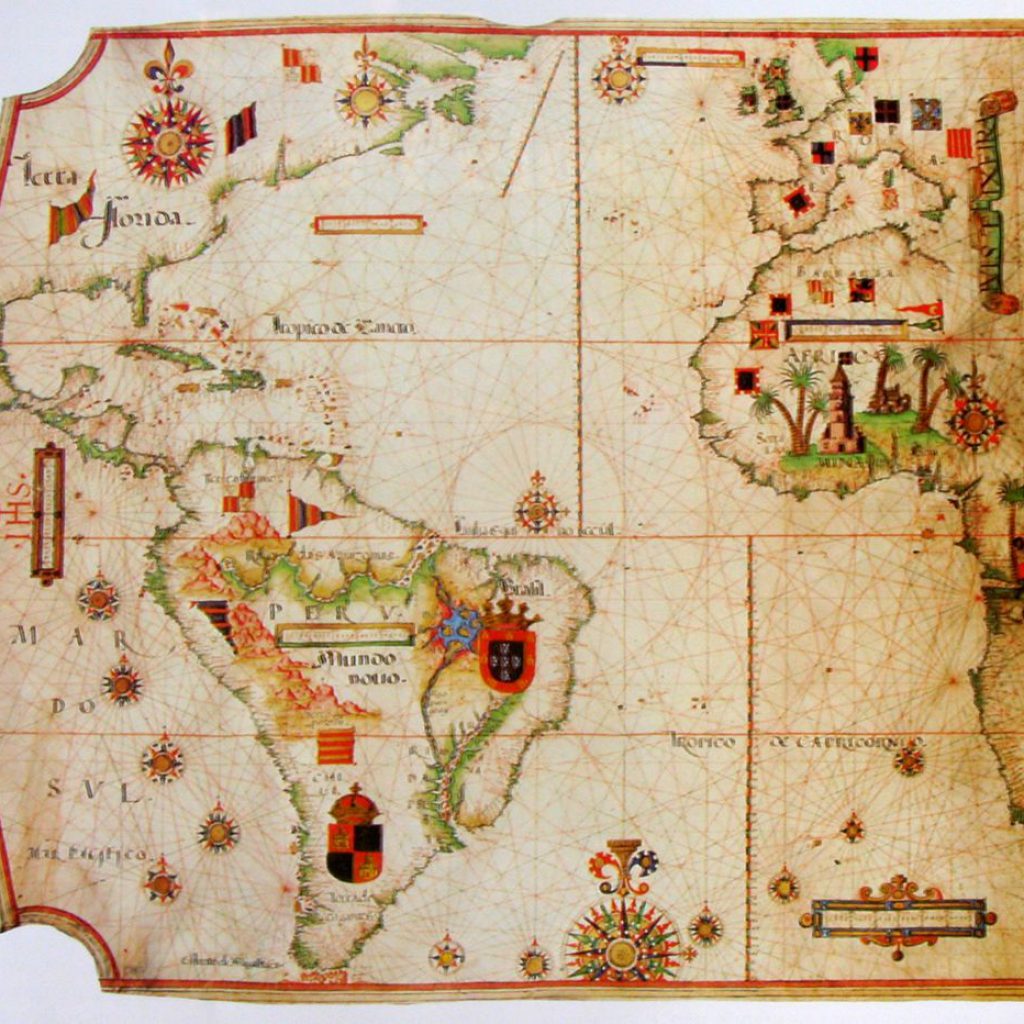 Carta Atlântica. Iluminura sobre pergaminho. Luís Teixeira (c. 1545-1604), 1565 (c.) Luís Teixeira (c. 1545-1604), filho do também cartógrafo Pedro Teixeira, mestre de fazer cartas de marear a 23 de maio de 1558 e irmão de Domingos Teixeira, que fazia cartas de marear desde 1565 e de Marcos Fernandes, com carta desse ofício em 1592. Seria depois pai de João Teixeira Albernaz, o velho (c. 1575-1662) e Pedro Teixeira Albernaz (c. 1595-1662), entre outros. Em 18 de outubro de 1564 teve autorização para poder fazer cartas de marear, instrumentos náuticos e regimentos de altura e declinação do Sol, após examinação […]