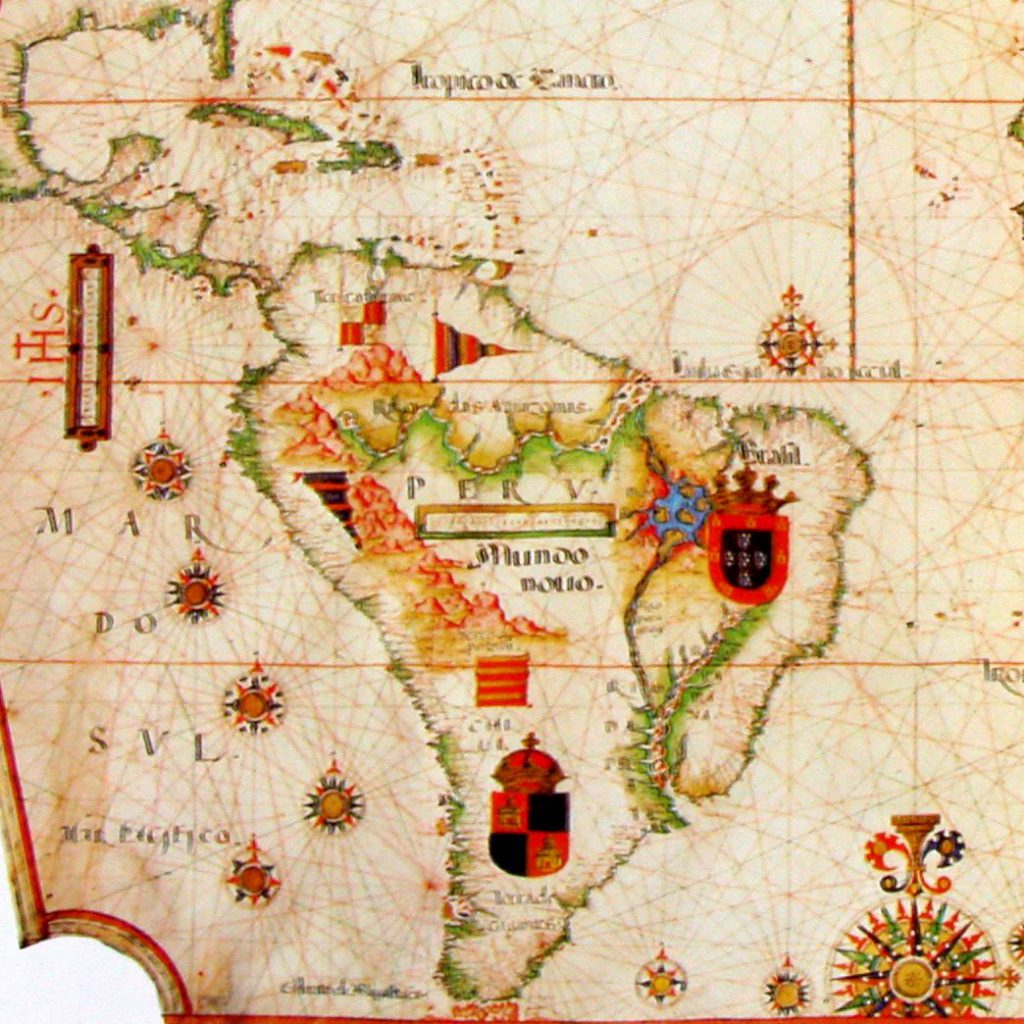Peru – Mundo Novo – Brasil. Pormenor da Carta Atlântica. Iluminura sobre pergaminho. Luís Teixeira, 1600 (c.) Biblioteca Nacional Central, Florença, Itália. Pub. in Oceanos, n.º 3, Bartolomeu Dias, o capitão do fim, revista da CNCDP, Lisboa, Março de 1990, p. 128. Luís Teixeira (c. 1545-1604), filho do também cartógrafo Pedro Teixeira, mestre de fazer cartas de marear a 23 de maio de 1558 e irmão de Domingos Teixeira, que fazia cartas de marear desde 1565 e de Marcos Fernandes, com carta desse ofício em 1592. Seria depois pai de João Teixeira Albernaz, o velho (c. 1575-1662) e Pedro Teixeira […]