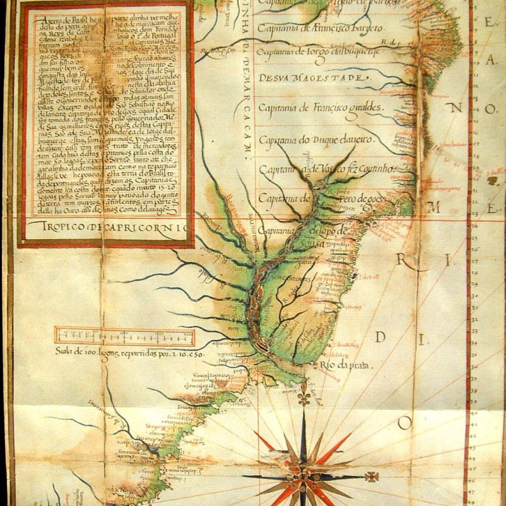 Terra do Brasil. Mapa do Brasil. Pormenor do Roteiro de todos os sinais (…) que há na Costa do Brasil, de Luís Teixeira (c. 1545-1604), 1587 (c.). Biblioteca Nacional da Ajuda, Lisboa, Portugal. Luís Teixeira (c. 1545-1604), filho do também cartógrafo Pedro Teixeira, mestre de fazer cartas de marear a 23 de maio de 1558 e irmão de Domingos Teixeira, que fazia cartas de marear desde 1565 e de Marcos Fernandes, com carta desse ofício em 1592. Seria depois pai de João Teixeira Albernaz, o velho (c. 1575-1662) e Pedro Teixeira Albernaz (c. 1595-1662), entre outros. Em 18 de outubro […]