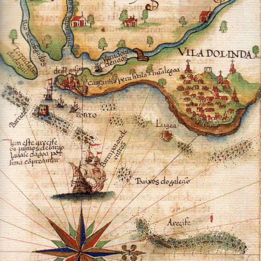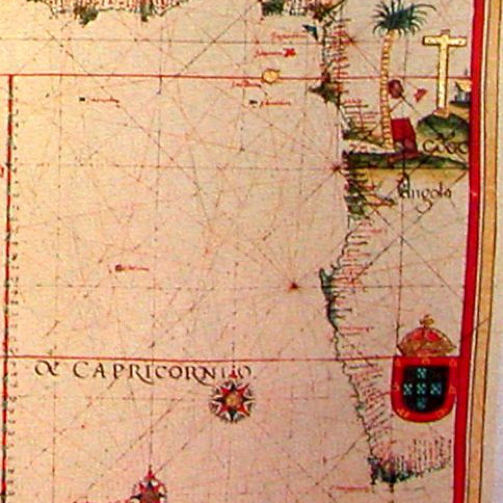 Costa de Angola. Pormenor da Carta Atlântica. Iluminura sobre pergaminho. Luís Teixeira (c. 1545-1604), 1600 (c.) Biblioteca Nacional Central, Florença, Itália. Pub. in Portugal no Mundo, direcção de Luís de Albuquerque, vol. II, As zonas de influência do Ocidente. Origem e desenvolvimento da colonização, Publicações Alfa, Lisboa, 1989, p. 170. Luís Teixeira (c. 1545-1604), filho do também cartógrafo Pedro Teixeira, mestre de fazer cartas de marear a 23 de maio de 1558 e irmão de Domingos Teixeira, que fazia cartas de marear desde 1565 e de Marcos Fernandes, com carta desse ofício em 1592. Seria depois pai de João Teixeira […]