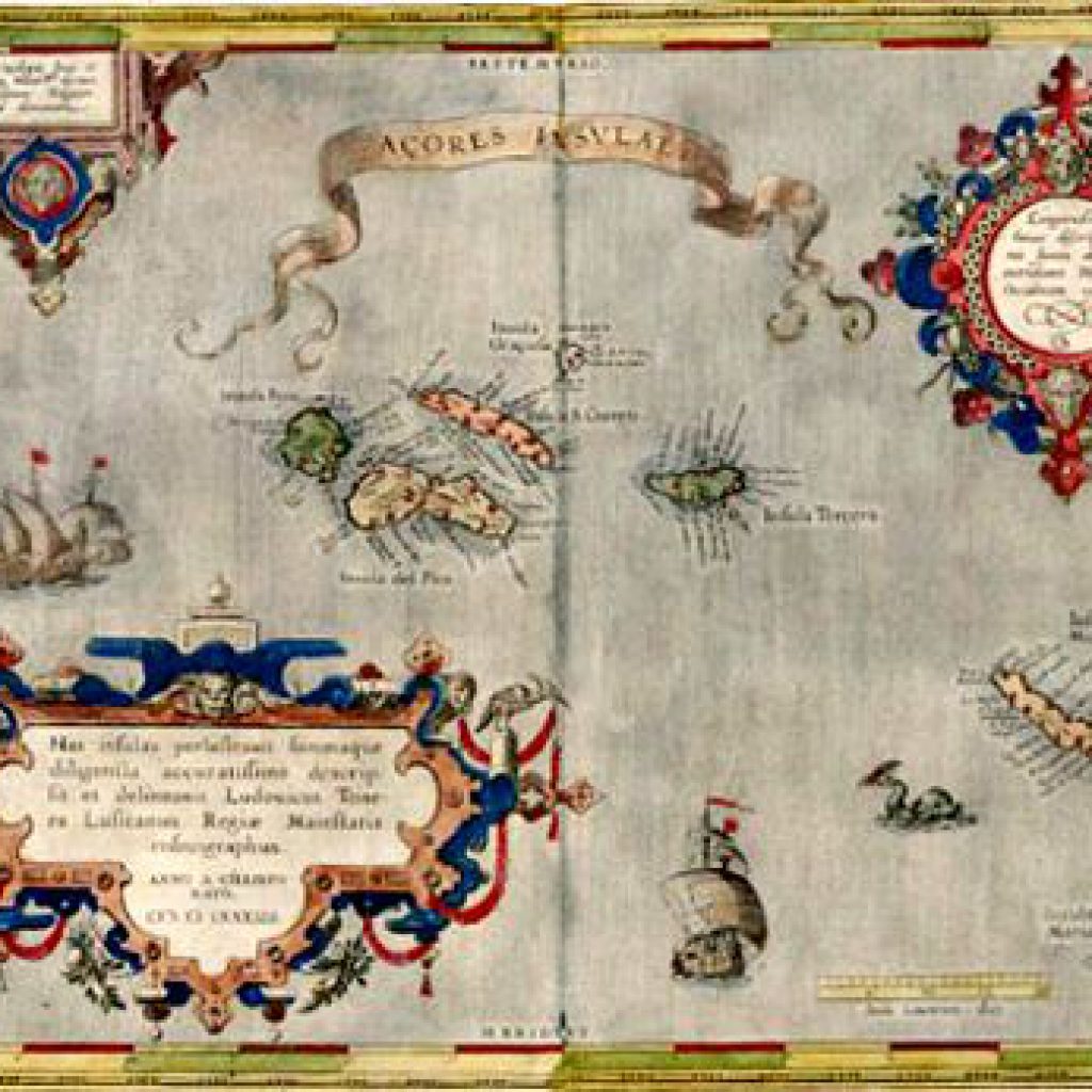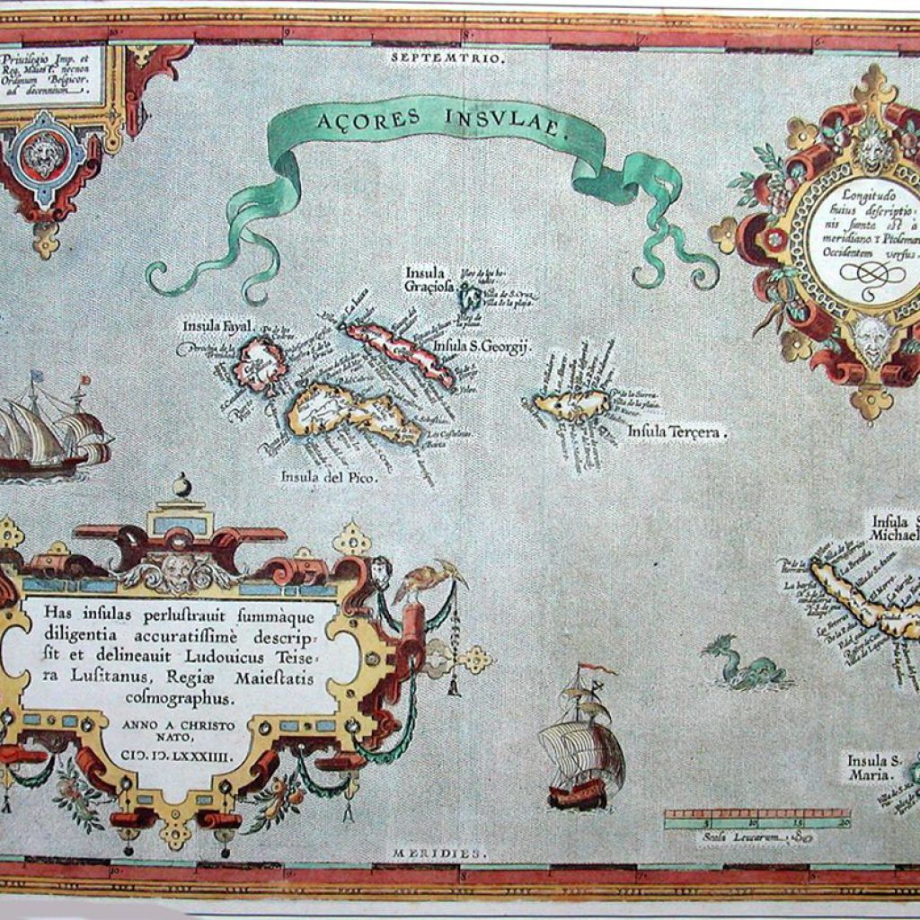 Açores insulae: has insulas perlustravit summàque deligentia accuratissime descripsit et delineavit Ludovicus Teisera Lusitanus. Gravura sobre cobre aguarelada, 29,9 x 43,5 cm. Esc. aprox. 1 : 1 250 000. Retirado de Abraham Ortelius Theatre de l’Univers (), Antuérpia, 1584. Colecção IAC, Angra do Heroísmo, ilha Terceira, Açores.