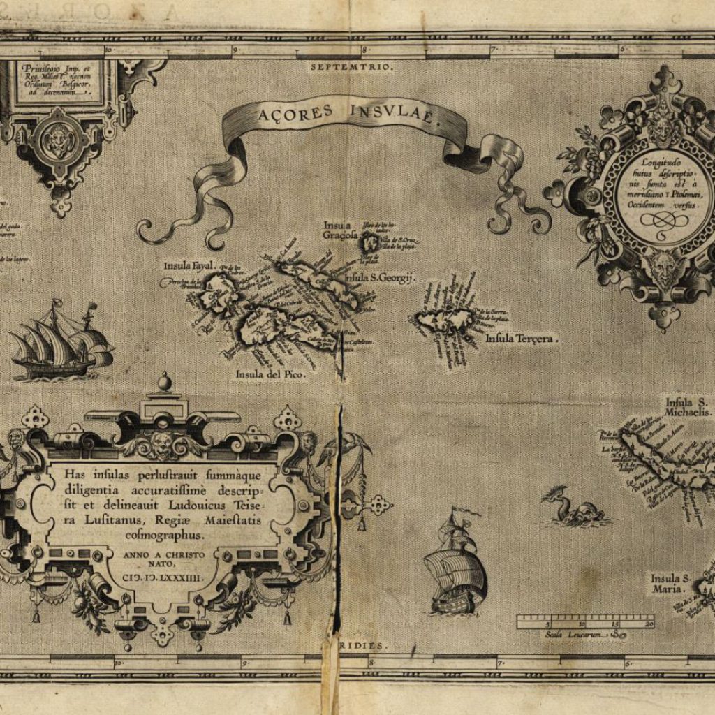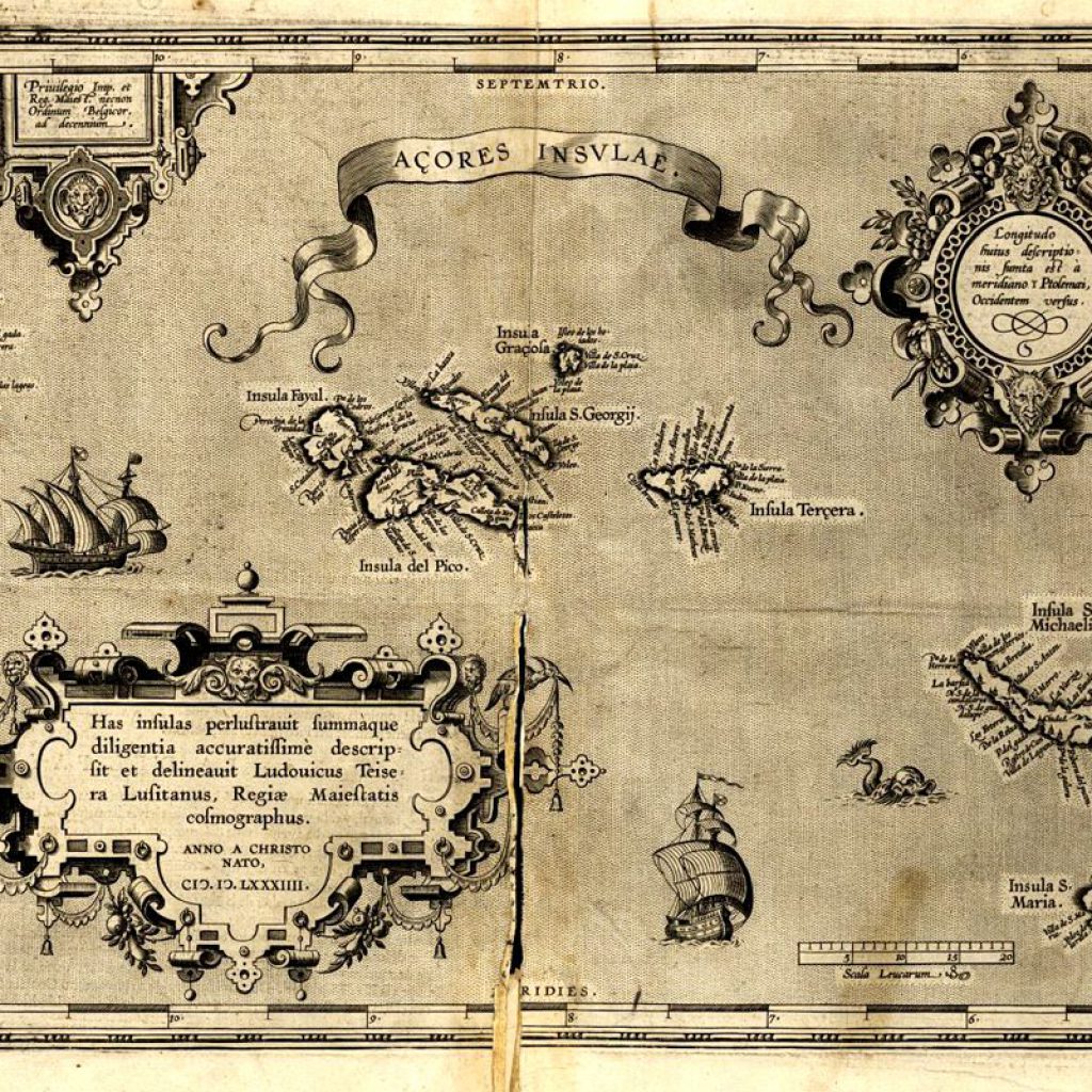 Açores insulae Ludouicus Teisera Lufitanus. Luís Teixeira (act. 1564; 1604). Gravura, 33,2 x 47,4 e 42,5 x 54,9 cm. Escala [ca. 1:3000000], 20 Leucarum [Portugal, 18 ao grau] = [4,05 cm]. Itália, 1584. Lisboa, Biblioteca Nacional (Cart. 974733).