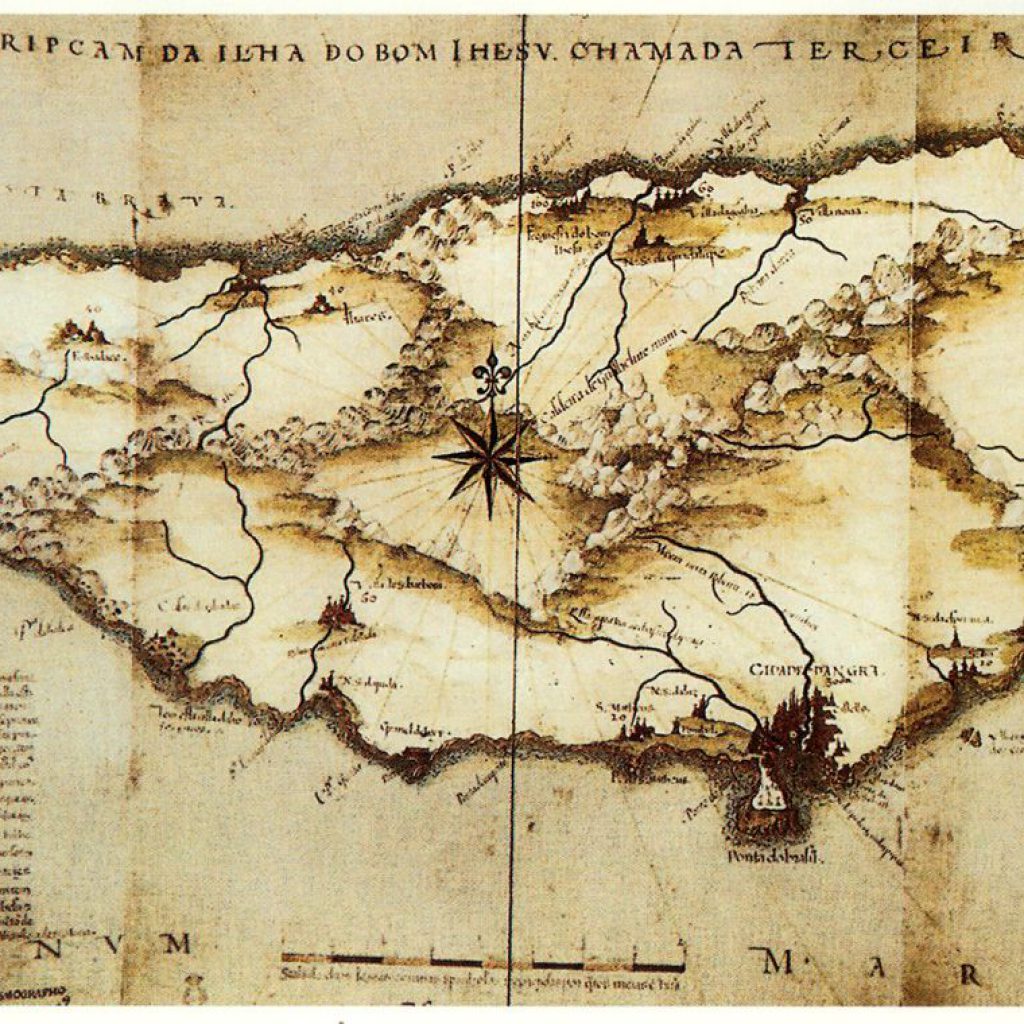 Descrição da Ilha do Bom Jesus, Chamada Terceira. Entre as ilhas dos Açores esta é a melhor e a mais fértil, assim, mais forte, a que melhor se pode defender. Em ela está a feitoria de El-Rei porque todas as Armadas que de todas as partes vêm cumprindo sua viagem, a ela vêm (…) Desenho aguarelado. Luís Teixeira, 1587. Biblioteca Nacional de Florença, Itália. Pub. Por João Campos, Impérios, Patrimónios e Identidade. Intervenções Pioneiras e Novidades Adquiridas, Lisboa, In-Libris, 2007, p. 122.