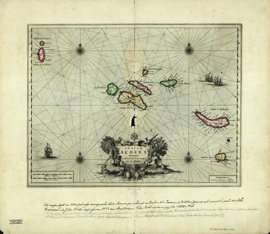 Insulae Açores. Gravura de mapa de Luís Teixeira (c. 1545-1604), 1584. A cartela no canto inferior direito regista: Amstelaedami: excud. Joannes Blaeu (1596-1673) In Atlas Universal de Blaeu, Amesterdão, 1672 (versão em castelhano). Pub. Carlos Luís Marques Castanheira da Cruz, Aspetos da defesa militar dos Açores no quadro Atlântico do ‘Mare liberum’; A fortificação de uma periferia: o caso da ilha de Santa Maria (séculos XVI-XVIII), dissertação de doutoramento apresentada à Universidade dos Açores, p. 22. Luís Teixeira (c. 1545-1604), filho do também cartógrafo Pedro Teixeira, mestre de fazer cartas de marear a 23 de maio de 1558 e irmão […]