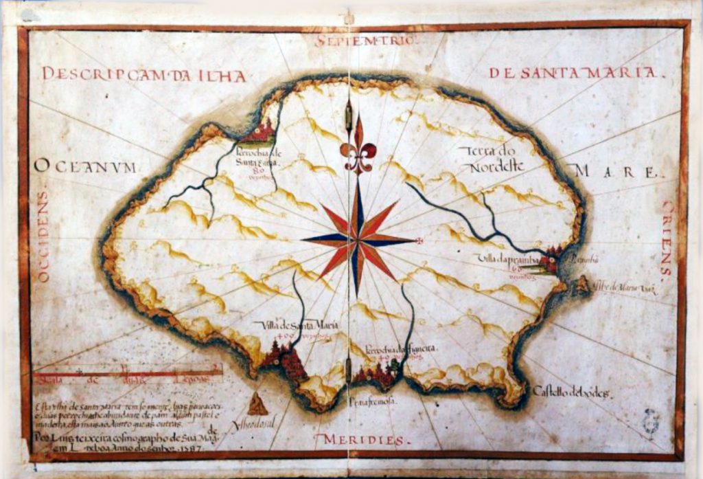 Descripcam da Ilha de Santa Maria. Manuscrito aguarelado, Luís Teixeira (c. 1545-1604), 1587, Luis Teixeira cosmographo de Sua Mag.de em Lixboa Anno do senhor 1587 Pertence ao grupo de 6 cartas dos Açores na Biblioteca Nazionale Centrale de Florença, Itália A legenda informa: Scala de duas legoas esta ylha de Santa Maria tem somente duas povoaçoes e duas perrochias he abundante de pam algum pastel e madeira, esta mais ao Austro que as outras. Pub. Carlos Luís Marques Castanheira da Cruz, Aspetos da defesa militar dos Açores no quadro Atlântico do ‘Mare liberum’; A fortificação de uma periferia: o caso […]